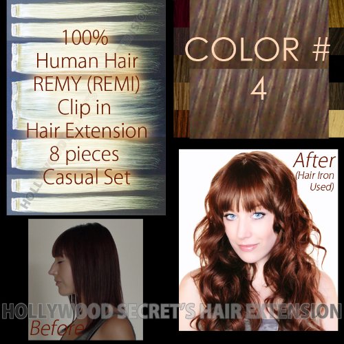 Hollywood Secret's Clip, Color#: Color#: 4 - Medium Brown --- Retail Price: $132 --- Brand: Hollywood Secret's Hair Extension --- Product Name: Clip Hair Extension (16-18 inches, 8 pc set) --- Style: Silky Straight - 100% Human Hair - REMY (REMI) --- Hollywood-Secret: We are the online discount beauty shop to bring high quality products to both professionals and consumers. We are organized as a division of Hollywood Secret Network, the beauty products manufacturer, which is located in Los Angeles, California, U.S.A., and producing super quality products for top salons, professional stylists and hair specialists. --- Hollywood Secret's Hair Extension is one of our super high quality brands, and the customers and their end-users are also including top salons, stylists, hair extension specialists, actress and models. --- Our hair extensions are produced in reliable factories and checked by experienced quality specialists, and also checked again by hair specialists in U.S. before they are shipped out to our customers like you. --- Recent Reviews: --- I have had NO experience with extensions before, and it was the first time I used them. I have medium length hair (brown-black color), and ordered these to add volume and length to a side swept style I was going to be wearing as bridesmaid for a wedding. They were SO easy to clip in and use, looked completely natural, and blended with my own hair extremely well... shipping was quick! - by: Anna - Ocala, FL - 11/16/2011 -- I love these extensions! I had no experience with these at all, and they are so easy to put in! everyone always compliments my hair now, and they blend so well! SO SATISFIED! thank you so much! best... - by: Denise - Ohio - 11/5/2011 -- I love my extensions. They match my hair color perfectly, even after I colored my hair a little darker they still blended in! Super easy to put in and super soft beautiful hair! I would recommend... - by: Manda - Iowa - 10/18/2011 --